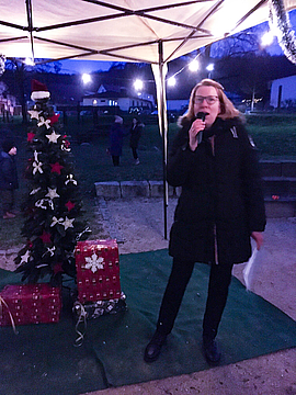 Eine kleine Bereicherung des Weihnachtsmarktes im Degerfeld bot am Freitag die Musikschule Butzbach mit ihrer erwachsenen Gesangsschülerin Jutta Barth. Sie trug schwungvoll und mit ausdrucksstarker Stimme "Journey to the past" aus dem Musical "Anastasia" von Stephen Flaherty zu einer Begleitung vom Band vor, welches sie gemeinsam mit ihrer Lehrerin Algund Schorcht erarbeitet hatte.