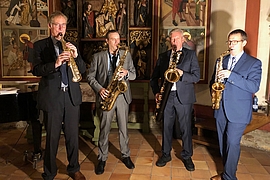 Nach der Pause dann Stücke von Billy Joel, Michael Jackson und Queen. Gerade das letztgenannte, nämlich „Don´t Stop Me Now“, öffnete bei den Zuhörenden diverse Schleusen. Animierte doch die mitreißende Version zum Mitklatschen und –bewegen. Das ruhige „Hello“ von Lionel Richie dann wieder in der Besetzung Klavier und drei Saxofone. Einen tollen Sound kreierten erst Andreas Tröster auf seinem Altsaxofon bei der Melodie zu den Klavierklängen, dann Bernd Niesner auf dem Tenorsaxofon zu Einwürfen musikalischer Phrasen durch das Sopransaxofon von Martin Zörb, welcher teilweise auch zum Altsaxofon griff. Wie im Jazzclub erhielten die Soli dann auch Applaus während des Stückes.