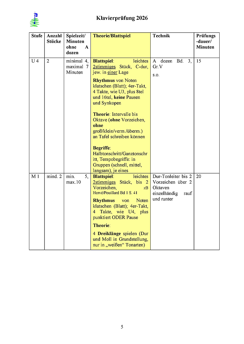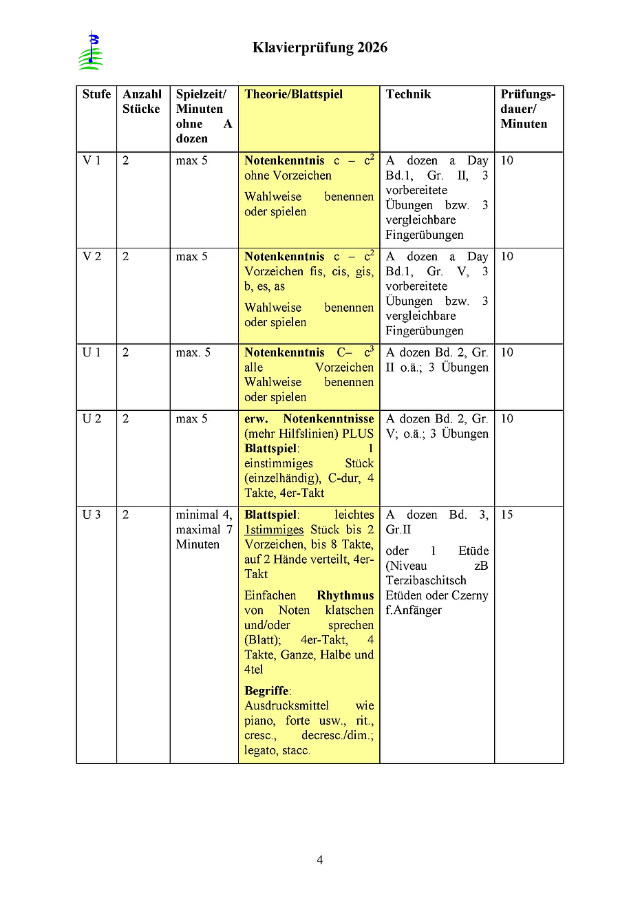 - Angaben über die erforderliche Anzahl der Spielstücke, der Inhalte der Theorie- bzw. Blattspiel- und der Technikprüfung sowie über die vorgesehene Prüfungsdauer sind der Tabelle auf S. 4 zu entnehmen.