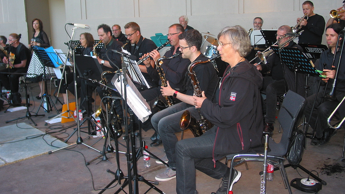 Weiter geht es dann mit der Big Band Black Dots unter der Leitung von Gerhard Brunner. Mit ihrem über 20jährigen Bestehen ist sie seit langem wichtiger Bestandteil der Musikschule. Gespielt werden swingende und fetzige Titel wie „Come fly with me“ von Michael Bublé, „Cheek to cheek“ von Irving Berlin, Soul Bossa Nova von Quincy Jones. In der Big Band ist bereits gut ein Viertel der im Titel genannten Instrumentenanzahl vertreten: Verschiedene Holz- und Blechblasinstrumente, eine Rhythmusgruppe und als Krönung der Gesang machen gemeinsam den typischen strahlenden Big Band Sound aus.