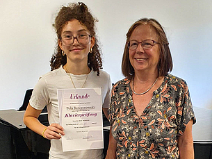 Im Tagesverlauf traten dann in diesem Jahr vier Schülerinnen bei der Klavierprüfung an aus den Bereichen Vorstufe, Unterstufe und Mittelstufe. Und sie zeigten, was sie schon draufhaben: schöne Klangfarben, musikalisches Gespür und zum Teil schon erstaunliche Sicherheit auf der Bühne. Hier wurde je nach Prüfungsstufe auch nach Notennamen gefragt, technische Übungen gefordert und eben auch das Blattspiel.