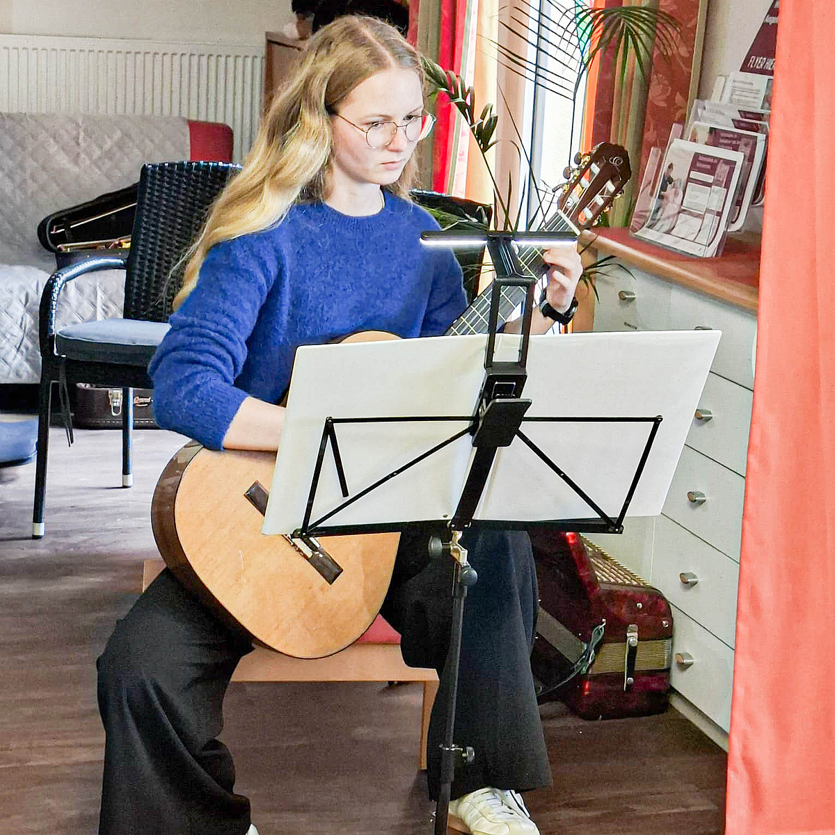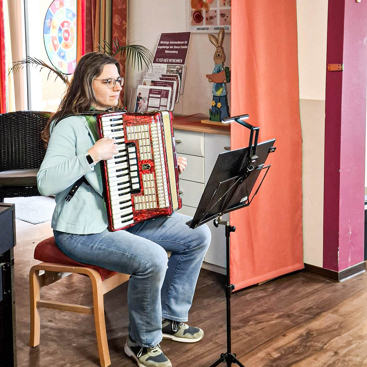 Dass man auch als Erwachsene an der Musikschule Butzbach mit einem Instrument neu starten kann, bewies Katrin Henß, die erst seit einem halbem Jahr Akkordeon spielt. Die beiden von ihr ausgewählten und geschmackvoll vorgetragenen Stücke „Schneewalzer“ und „Band of the Ohio“ regten die BewohnerInnen zum Schunkeln an.