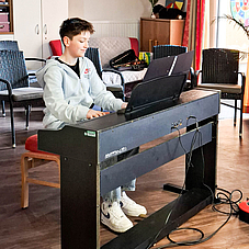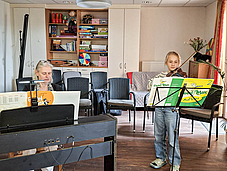Den Anfang machte Fabian Jung, Keyboardschüler von Petra Jehle mit den beiden Volksliedern „Der Kuckuck und der Esel“ und „Auf der Mauer, auf der Lauer“ und animierte mit seinem beeindruckenden Spiel einige Bewohner zum mitsummen. Sehr rhythmisch wurde es dann mit einer Polonaise vorgetragen von einer Geigenschülerin von Elke Wagenhäuser, Luise Wittorf. Gemeinsam mit Marion Adloff, die die Begleitung am Klavier übernahm und auch sonst das Programm moderierte, gestaltete Luise die beiden verschiedenen Charaktere des schwungvollen Stückes mit seinem ruhigen Mittelteil musikalisch überzeugend.