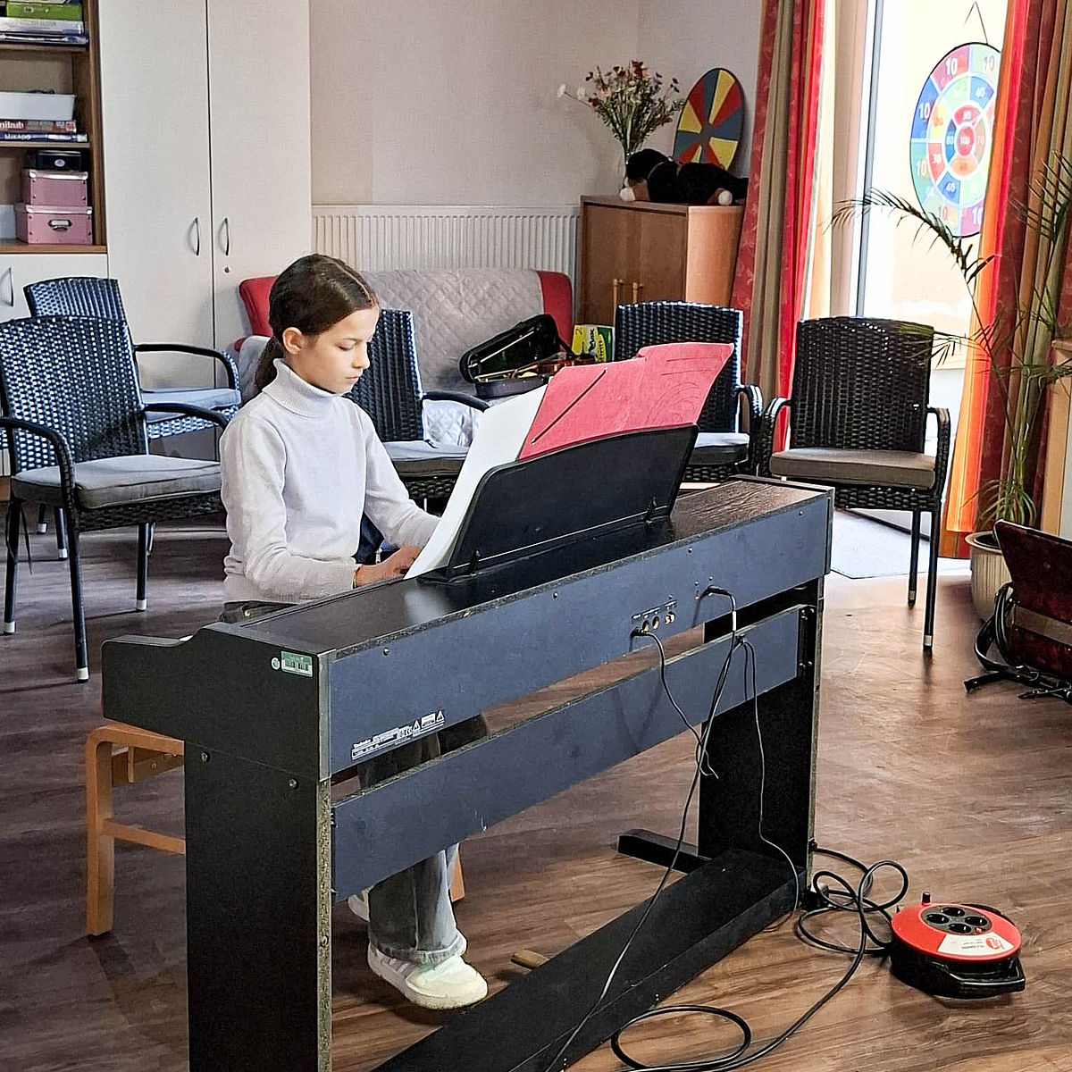 Gerne versammelten sich viele interessierte Bewohner des Seniorenwohnheims Gambach der DOREA Familie Münzenberg am Dienstagnachmittag in ihrem Aufenthaltsraum für ein kleines Konzert der Musikschule Butzbach. Schülerinnen und Schüler aus Gambach und Butzbach hatten sich gezielt mit einem abwechslungsreichen Programm vorbereitet.