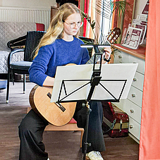 Finnja Schrader, Gitarrenschülerin von Jemal Malasidze, brachte in einer ansprechenden Bearbeitung „Für Elise“ von Ludwig van Beethoven zu Gehör. Das Thema mit dem berühmten Wechsel der beiden Töne gestaltete sie mit einfühlsamem Spannungsbogen, ein Genuss für die Zuhörenden.